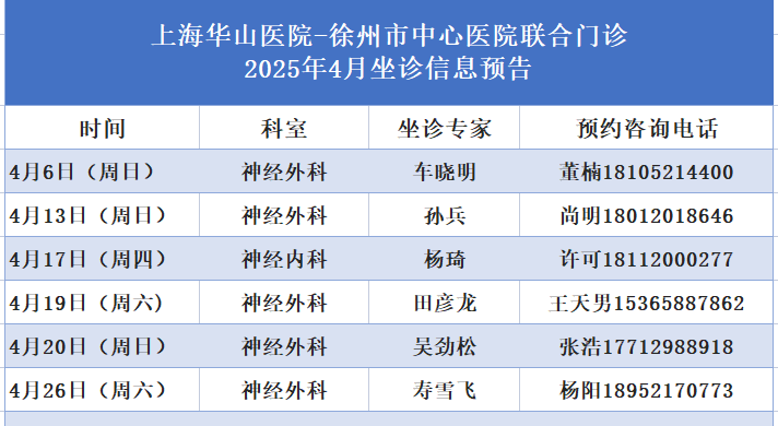 “上海华山医院-徐州市中心医院联合门诊”4月份专家坐诊信息预告