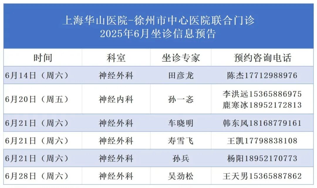 “上海华山医院-徐州市中心医院联合门诊”6月份专家坐诊信息预告