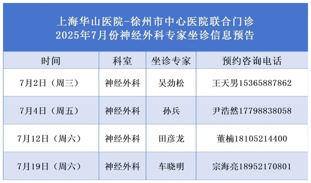 7月份,上海华山医院神经外科专家车晓明、吴劲松、田彦龙、孙兵将坐诊我院“上海华山医院-徐州市中心医院联合门诊”,专家号源陆续发放,具体信息如下: