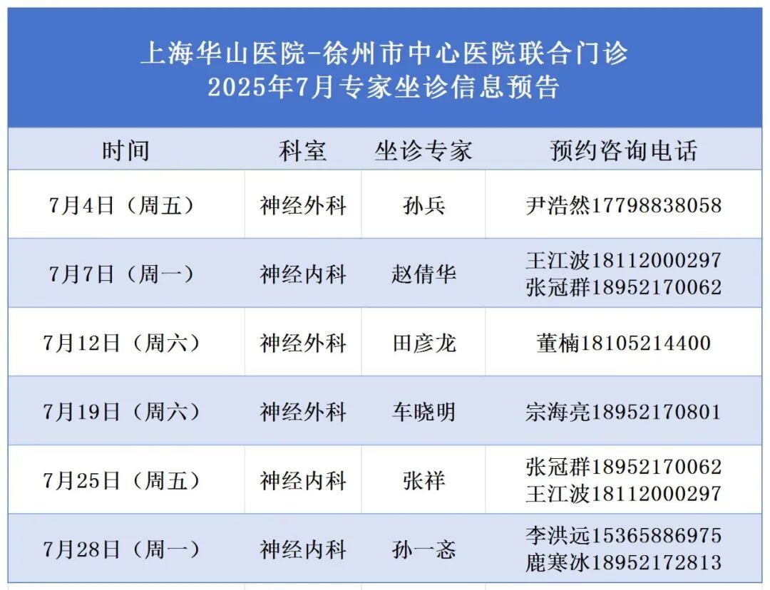 7月份,上海华山医院神经内科专家赵倩华、张祥、孙一忞教授,神经外科专家车晓明、田彦龙、孙兵将坐诊我院“上海华山医院-徐州市中心医院联合门诊”,专家号源陆续发放,具体信息如下: