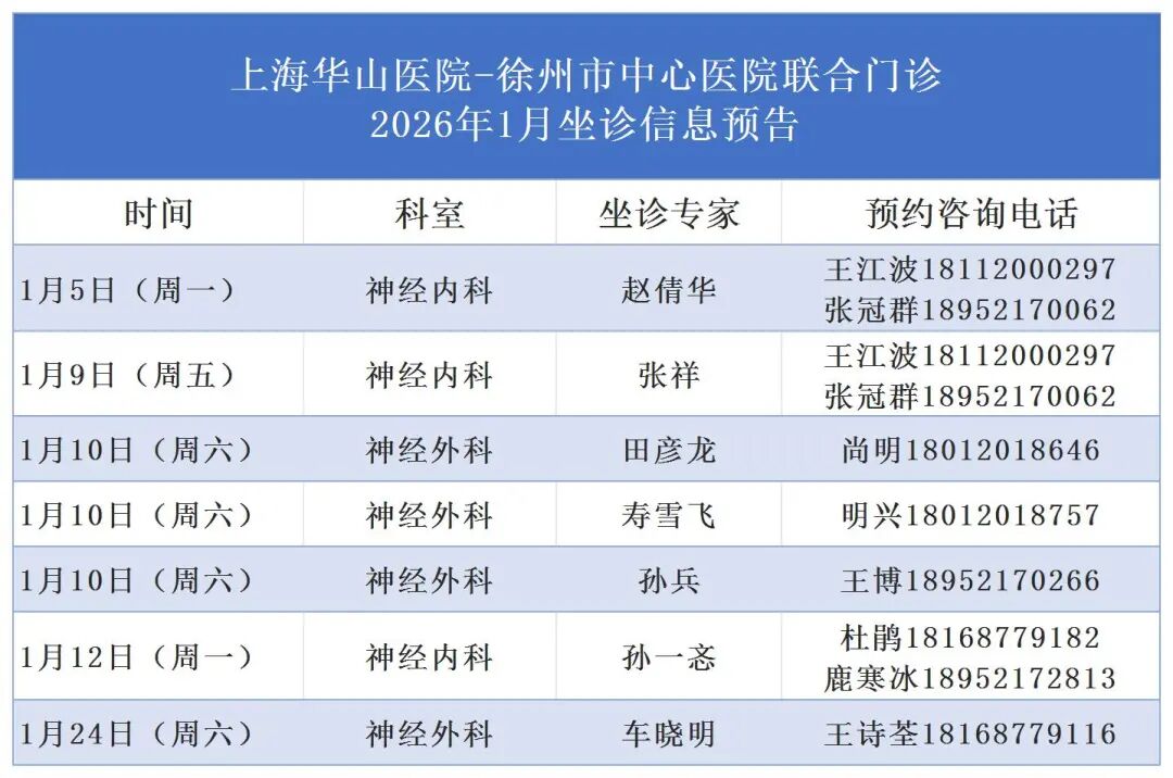 2026年1月,上海华山医院神经内科、神经外科专家坐诊“上海华山医院-徐州市中心医院联合门诊”,专家号源陆续发放,具体信息如下: