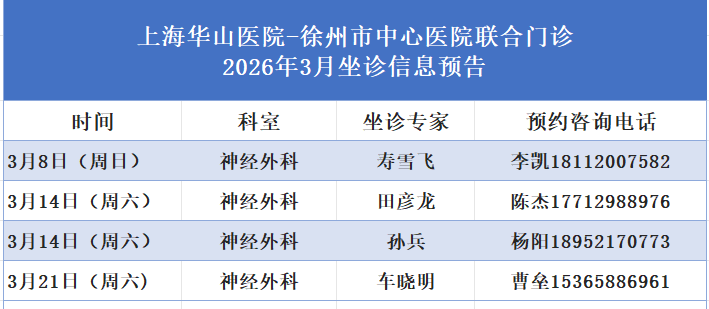 “上海华山医院-徐州市中心医院联合门诊”3月份神经外科专家坐诊信息预告