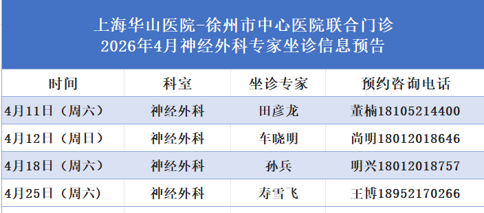 “上海华山医院-徐州市中心医院联合门诊”4月份神经外科专家坐诊信息预告