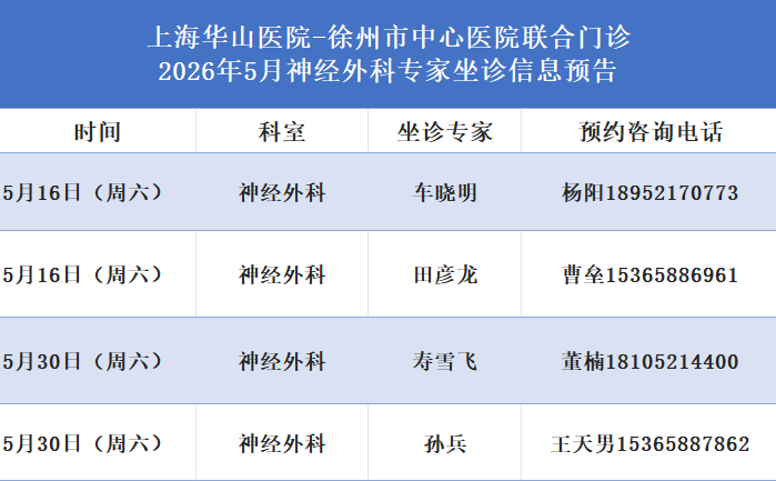 5月,上海华山医院神经外科专家田彦龙、车晓明、寿雪飞、孙兵将坐诊“上海华山医院-徐州市中心医院联合门诊”,专家号源陆续发放,具体信息如下: